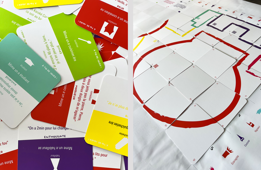 Final : Création d'un jeu de carte avec 2 faces, le recto est ludique et les joueurs doivent mimer ou lire une didacalie pour trouver un métier. Une fois deviné, au verso ils doivent trouver le lieu où ils travaillent.